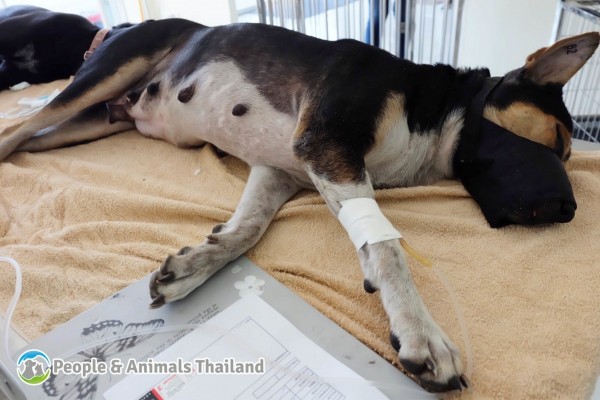 Toevallig was het een oudere vrouwtjeshond die in haar leven al veel pups had gehad. Ze maakte ook deel uit van een groep honden die gebracht waren door onze geweldige Khun Tim. Tot op heden heeft ze meer dan 400 dieren naar de kliniek gebracht.